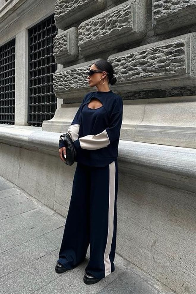 Elevate your streetwear game with this statement navy blue tracksuit featuring a bold chest cutout and wide-leg silhouette. Designed for modern fashion lovers who value both comfort and impact, this two-piece set is made from soft, breathable fabric that flows with your movement. The contrast beige sleeve and side stripe add a stylish twist, while the oversized top and flowy pants create a relaxed yet elevated look.